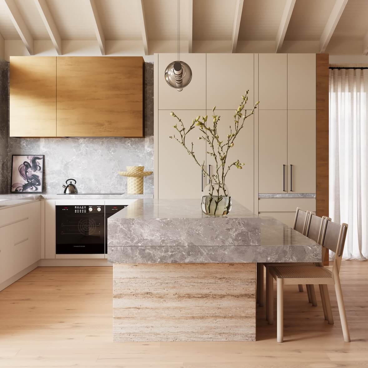 Walk into a cozy kitchen and dining room that brings together the calm of nature and the joy of cooking specially. This Ethereal House Project uses simple, soft colors to create a peaceful but exciting place to eat and spend time. The mix of quiet, natural feelings with the excitement of trying delicious food transforms dining here. It becomes a new and better experience. This place demonstrates that simple beauty and good food can make mealtime special. It invites everyone to enjoy their time and their meals even more.